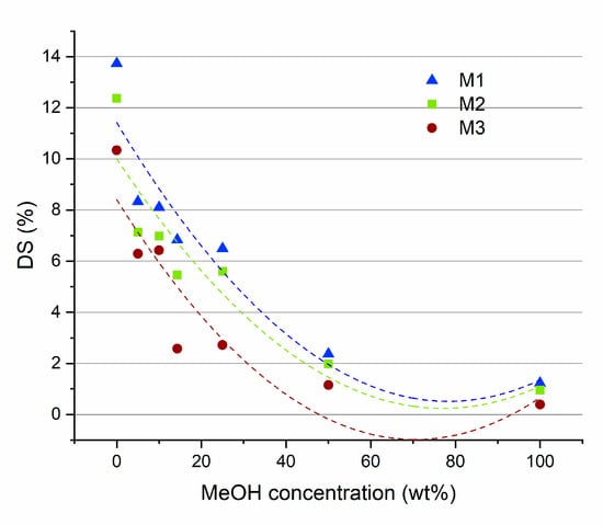 Measuring the degrees of swelling (DS) for the M1, M2 and M3 membranes, at different MEOH/MTBE concentrations, yielded the results that are presented in Figure 7. For all these membranes, the highest DS values were observed in pure MTBE (from 10 to 14%). Increasing the concentration of MeOH in the solvents mixture caused a decrease in the measured DS, reaching the lowest values in pure MeOH (about 1.5%). These results can be related to the Hansen solubility parameters of the polymer and the solvents. PLA has a total solubility value (δt) of 21.73 which is close to that of MTBE (δt = 15.73) with respect to that for MeOH (δt = 29.60) [5,59]. Closer solubility values are an indication of a higher affinity between the two species. The higher affinity of PLA for MTBE is reflected in larger swelling of the membrane, in comparison to MeOH.