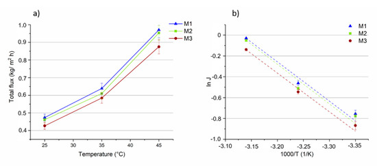 (a) The total fluxes through the M1, M2 and M3 membranes as a function of the temperature (vacuum permeate pressure: 0.09 mbar). (b) Arrhenius plot of total flux through the membranes.