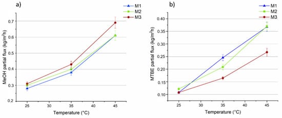MeOH (a) and MTBE (b) partial fluxes through the M1, M2 and M3 membranes as a function of the temperature (vacuum permeate pressure: 0.09 mbar).