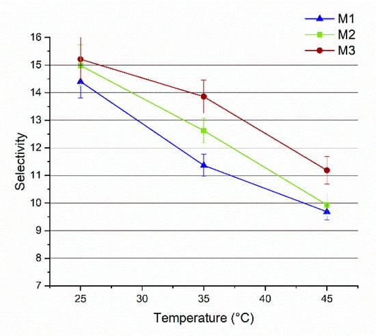 Selectivity of M1, M2 and M3 membranes as a function of the temperature (vacuum pressure: 0.09 mbar).