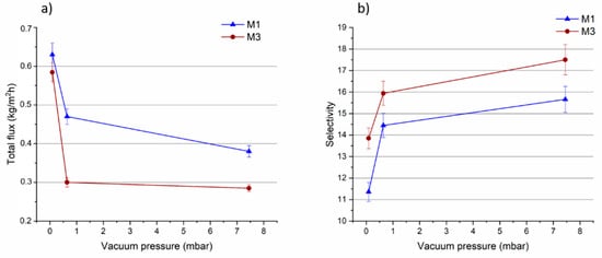 The selectivity, on the contrary, increased for both membranes as the vacuum pressure was decreased (as shown in Figure 11b).