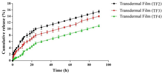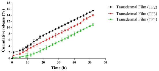 | Transdermal film (TF2) | 23.32 ± 4.91 | 35.42 ± 3.92 | 55.92 ± 1.97 | 67.81 ± 3.04 | 81.96 ± 2.73 | 95.71 ± 6.51 | 98.72 ± 4.01 |