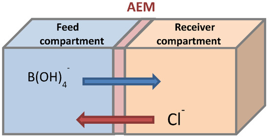 Water present in nature may often neither be used for human consumption nor for industry use, because it may contain relatively high concentrations of various chemical compounds such as boron. There is a small range between boron deficiency and boron toxicity in vegetable crops and other plants [1]. Boron is an essential nutrient for plants; a very low boron content is required in irrigation water for certain metabolic activities, but an increased boron concentration to 4 mg/L [1] leads to poisoning, reflected by yellowish spots on leaves and fruits, and accelerates decomposition and kills the plants [2]. In drinking water, high boron concentrations can be also toxic to humans. The WHO indicate that the concentration of boron in drinking water should be less than 0.3 mg/L [3]. The boron concentration is around 5 mg/L in seawater [4]. The growth in knowledge of the science of boron in recent years has been of great commercial and environmental importance because the element is used in a wide range of industrial applications such as in insulation and textile-grade fiber, borosilicate glass, fire retardants, enamels, glazes and agriculture. The presence of boron in water originates from different sources, such as mineralization. In urban wastewater systems, boron is mainly found in the form of boric acid or borates. Boron removal has been investigated using adsorption [5,6], electrocoagulation [7,8], electrodialysis [9,10], reverse osmosis [11,12], nanofiltration [13,14], microfiltration [15], ion-exchange [15,16], membrane distillation [17] and Donnan dialysis [18,19]. In order to choose the simplest and continuous method, Donnan dialysis was conducted in this study. This process is easy to handle and only requires a few chemicals and low pumping energy. Donnan dialysis is widely used to recover or concentrate [20,21,22] and eliminate various ions such as nitrates [23], nitrates and nitrites simultaneously [24], fluorides [25,26,27], chromium [28,29], phosphates [30] and boron [18,19].