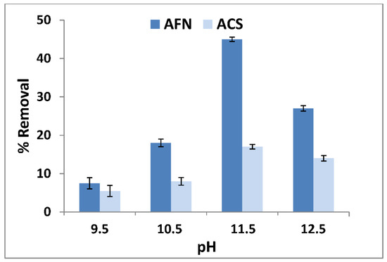 The effect of pH was studied first, due to its impact on the transport of boron from the feed compartment to receiver compartment. As shown in Figure 2, the highest removal of boron was obtained at a pH of 11.5, with 45 ± 0.6% for the AFN membrane and 17 ± 0.6% for the ACS membrane. This can be explained by the two existing forms of boron species in aqueous solution under different pH values, which were boric acid B(OH)3 in dilute aqueous solution below pH 7, and above pH 10, the metaborate anion became the dominant species in solution [39,40]. However, above pH = 11.5, the transport of boron was probably affected by the presence and competition with OH−, which decreased boron removal because hydroxyl ion transport was preferred, because the mobility of OH− is much higher than that of boron. In fact, the transport of boron is a process which involves three steps: the boron in feed solution is exchanged with ions or ionizable groups in an anion-exchange membrane; boron is transported in a membrane to the side of the receiver solution; and boron is transferred to a receiver solution with counter ions [21,26]. Thus, it may be concluded that the highest boron transport was achieved at pH = 11.5 for the two used membranes.