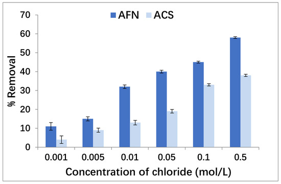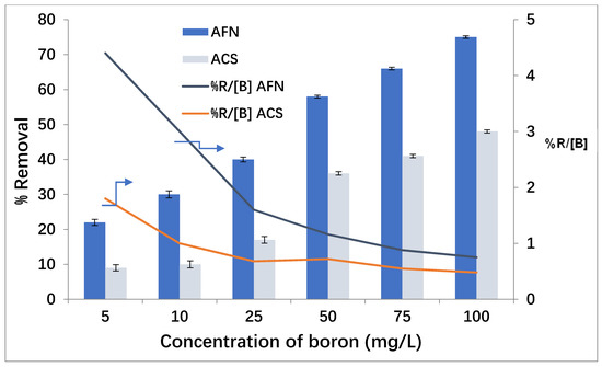 As presented in Figure 4, the increase in initial concentration of boron from 5 mg/L to 100 mg/L contributes to maintaining the high concentration gradient of boron, involving an improvement in the cross-ion transfer between Cl− and . At the lowest concentration of boron in the feed compartment (5 mg/L), the removal was 22 ± 1% for AFN and 9 ± 1% for ACS. The increase in boron concentration from 10 mg/L to 100 mg/L improved their removal from 30 ± 1% to 75 ± 0.37% with AFN and from 10 ± 1% to 48 ± 0.5% with ACS. A similar result was reported by Tor [44].