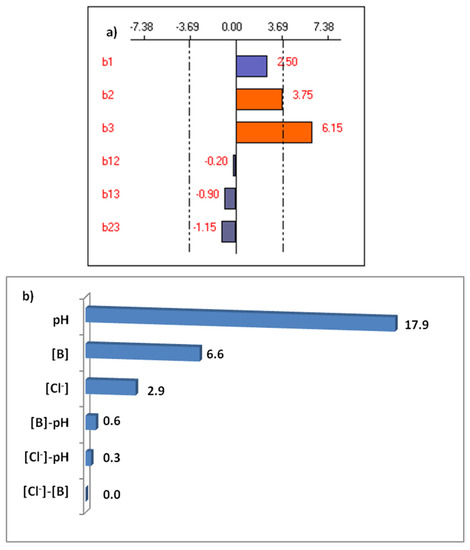 In Table 6, the coefficients are presented, which shows that the pH of the feed compartment had an important effect (b2 = 18.81) on the removal of boron. The second influencing factor was the boron concentration (b3 = 9.12). However, the concentration of chloride had a less important effect on the removal of boron (b1 = 3.01).