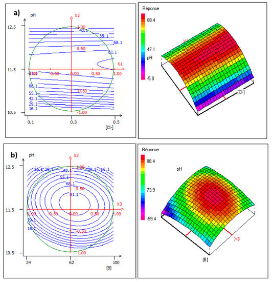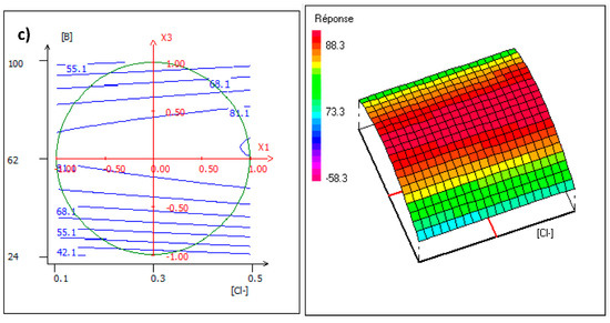 Figure 6a shows the combined variation of chloride concentration and pH at a constant boron concentration of 62 mg/L. The shape of the contour plots shows that only around pH 11.5 did boron removal improve with an increasing chloride concentration from 0.1 mg/L to 0.3 mg/L. This was attributed to the existing forms of boron in aqueous solution under different pH values. is the dominant species at higher pH values. However, above pH 11.5, the transport of boron is probably affected by the presence and the competition with OH−, which decrease the removal of boron. Thus, it can be concluded that the highest boron transport was achieved at pH 11.5. Figure 6b presents the variation between the concentration of boron and pH at a constant chloride concentration of 0.3 mol/L. This result confirms that the pH greatly affects the removal of boron; this is reflected in the shape of these iso-response curves, which are concentrated in the center of the domain. This was expected because the pH and the chloride concentration were the factors which had a positive effect on the removal of boron. Figure 6c shows the variation in chloride concentration and boron concentration at a constant pH of 11.5. The shape of the contour plots show that only around a boron concentration of 62 mg/L did its removal improve when increasing the chloride concentration from 0.1 mg/L to 0.3 mg/L.