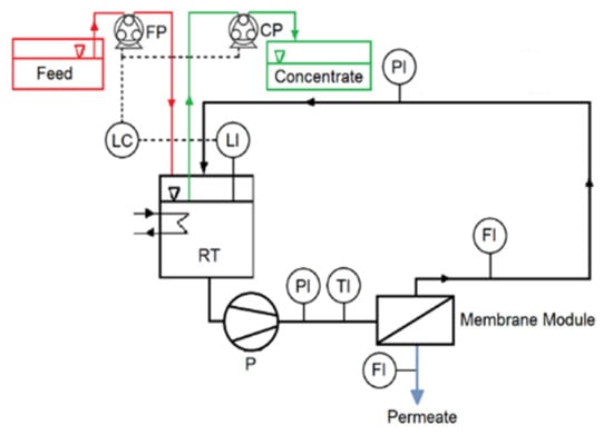 Schematic representation of the system. FP: Feed pump; CP: concentrate pump; RT: recirculation tank; P: pressure; T: temperature; F: flow; and L: level.