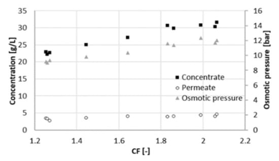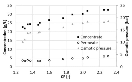 Data were collected over a period of 15 days during the filtration experiment at 22 bar. After setting CF to the desired value, the sampling was performed at least one day later, to give the system time to stabilize. The average volumetric flowrate of the feed varied significantly, namely from 10 mL/min (at a CF of 2.3) to 62 mL/min (at a CF of 1.3). This was caused by the strong dependence of the permeate flux on CF. Increasing CF implied a lower flux through the membrane due to the high concentration in the feed channel. In turn, the level in RT decreased more slowly, and the feed and concentrate were pumped in and out less frequently. The total flowrate of the permeate withdrawn from the system varied from 5.8 to 14.5 mL/min. The average volumetric flowrate of the concentrate varied accordingly from 4.3 to 47 mL/min. Figure 2, Figure 3 and Figure 4 depict the concentration of acetic acid in the concentrate and in the permeate, as well as the osmotic pressure, the parameters Rc and Rw, and the retention of ammonium and acetic acid as a function of the concentration factor.