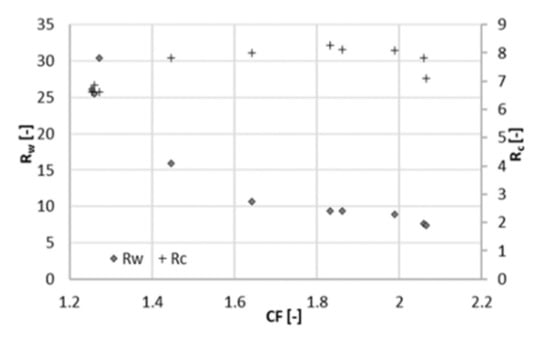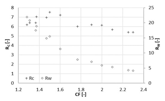 Concentration ratio (Rc) and mass ratio (Rw) at different concentration factors CF (22 bar).