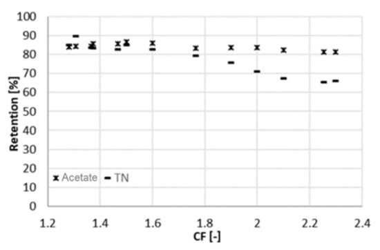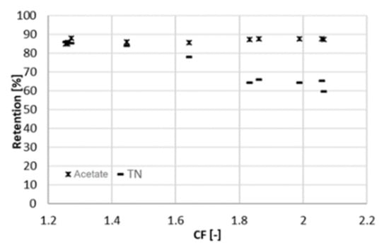 The results concerning the retention are consistent with the literature. XLE was already used under similar conditions and at comparable acetate concentrations, retaining 85% of acetate []. The retention (Figure 4) is negatively affected by an increase in the concentration factor. This was due to the higher concentration of the solution facing the membrane, with the consequences described above. However, the decline in retention was more pronounced for the total nitrogen (as an indicator of ammonium concentration) than for acetate. This might be due to the positive charge of ammonium, which is more easily pushed through the negatively charged membrane, as the ionic strength in the feed channel increased.