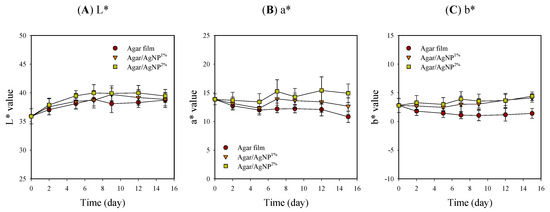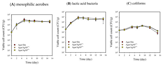 Microbial populations of beef samples packaged with the agar composite films containing 0, 1, and 2% AgNPs during storage at 5 °C are shown in Figure 1 and Figure 2. All the packaging treatments did not achieve a bactericidal or bacteriostatic effect for mesophilic aerobes and lactic acid bacteria, resulting in an increase of approximately 2 Log cycles after 15 days of storage. Previously confirmed potent antibacterial activity of the agar composite films with 1–2% AgNPs could not be observed against the natural beef microorganisms tested in the present work [27]. Such a result is not reportedly unusual because the inactivation of silver is favored by the presence of proteins and other biomolecules [11]. However, in coliform bacteria, viable cell counts increased by 1 Log CFU/g until nine days of storage and then decreased by more than 1 Log cycle. Thus, the reduction of coliform bacteria was presumably associated with the growth of lactic acid bacteria on beef samples.