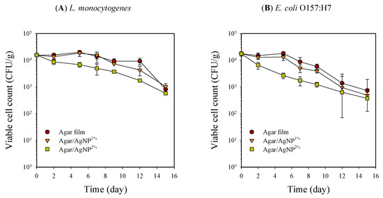 Overall reduction of the inoculated pathogens on beef samples packaged in the agar films with or without AgNPs was probably due to the proliferation of lactic acid bacteria during storage. The addition of certain strains of lactic acid bacteria to ground beef reportedly inhibited the growth of pathogenic bacteria such as Salmonella, E. coli, and Staphylococcus at refrigeration temperatures [6,39,40]. Reduction of viable cell counts by 2–3 Log cycles for Salmonella and E. coli O157:H7 could be achieved with lactic acid bacteria of about 107 CFU/g after storage of 5 days at 5 °C [39].