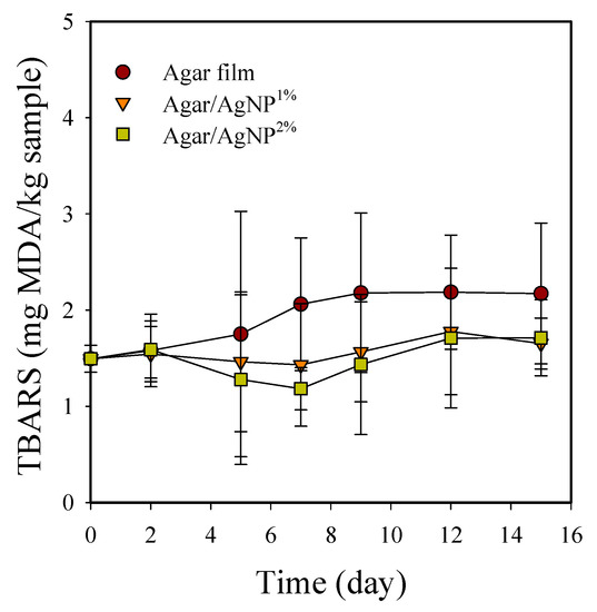 TBARS of packaged beef samples increased significantly (p < 0.05) during storage at 5 °C (Figure 4). TBARS value was initially 1.5 ± 0.1 mg MDA/kg and gradually increased to 2.2 ± 0.6 mg MDA/kg in the control samples after 15 days. TBARS is well known to correlate with off-flavor development in chill-stored beef [45]. In general, lipid oxidation results in odor and flavor degradation as unsaturated fatty acids react with molecular oxygen through free radical transfer reactions to form fatty acyl hydroperoxides or peroxides, which cause off-flavors [5]. Lipid oxidation is also reportedly associated with metmyoglobin formation and meat discoloration [46]. Campo et al. [47] have previously demonstrated that off-flavors such as rancidity in beef can be detected by humans when TBARS values are greater than or equal to 2.0 mg MDA/kg meat. Only the control group showed TBARS values above 2.0 mg MDA/kg beef after seven days in our present study. However, in the beef samples packaged with the silver-incorporated agar films, TBARS values remained below the acceptable threshold of 2.0 mg MDA/kg beef over the storage period. The results indicate that the agar/AgNP composite films partially working as an antioxidant could retard oxidative rancidity in the stored meat. Indeed, AgNPs stabilized with cellulosic polymers have shown the notable antioxidant activity measured as the DPPH scavenging percentage at the level of approximately 30–40% of ascorbic acid used as a positive standard [48].