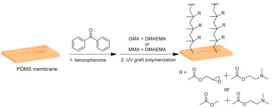 Ultra-violet grafting of polydimethylsiloxane membranes with the monomers glycidyl methacrylate or methyl methacrylate with 2-(dimethylamino)ethyl methacrylate.