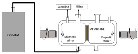 Pertraction experiments were performed in a closed, cylindrical stainless-steel cell with a 5.8 cm diameter and 6 cm length, as represented in Figure 2. The cell consisted of two compartments separated by a stainless membrane holder disc where the tested membranes were placed. Each membrane side compartment had a volume of 70 mL. The experimental temperature was kept at 25 °C for all pertraction tests using a thermostat. The tested membranes were roundly shaped with diameter of 2.5 cm. The active side of the membrane faced the feed solution. Both feed and permeate solutions were stirred with a magnetic stirrer during the whole experiment.