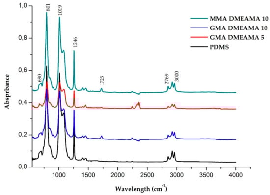 The FTIR analysis of PDMS and the modified membrane surfaces are compared in Figure 4. Using this analysis, it was important to visualize the functional groups of the modification molecules. For all three modified membranes, the shifted resonance of a conjugated ester function at 1725 cm−1 of the three modification molecules, methyl methacrylate, glycidyl methacrylate, and 2-(dimethylamino)ethyl methacrylate, were detected []. The C–N stretch of amine group of 2-(dimethylamino)ethyl methacrylate could be detected in the 1250–1020 cm−1 region []. However, the adjacent intense peaks at 873 cm−1, 1019 cm−1, and 1246 cm−1 corresponding to the Si–O stretch, O–Si–O symmetrical stretch, and CH3–Si/ CH3–Si–CH3, both deformation and scissoring stretches, respectively, eclipses the amine group bend [,,]. Alternatively, DMEAMA groups may be totally covered; then, the amine function remains unobserved in the spectra of the modified membranes. The ester resonance detected at 1725 cm−1 proves the successful modification of the three membranes, and is in accordance with the previously published reports of grafted poly(methacrylate) polymers on membranes []. The observed absorbance at the region 3000–2769 cm−1 is linked to C–H stretch of the alkaline groups [,].