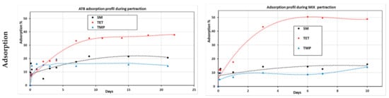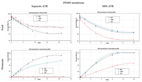 Aiming to study membrane–pollutant interaction and pollutants’ synergic effects on separation process, pertraction using the PDMS membrane was performed with three different antibiotics (ATBs): SM, TMP, and TET model solutions (both mixed (MIX) and each pollutant separately) (see Figure 6).