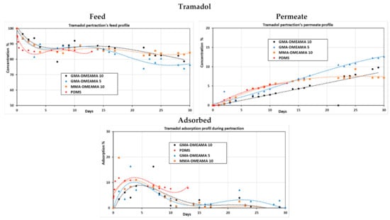 Adsorption, permeate, and feed profiles of the tramadol solution during the pertraction process with bare and modified PDMS membranes.