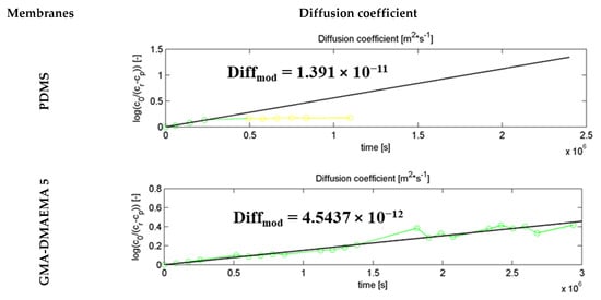 Diffusion coefficients were evaluated using a simplified analytical model, based on Fick’s 1st law. This law describes mass transport through the membrane, where diffusion is the only transport mechanism through a homogenous medium, as follows: