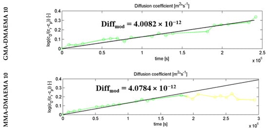 Figure 8 represents the diffusion coefficient calculation model, which corresponded perfectly to the experimental one of both GMA-DMAEMA 10 and GMA-DMAEMA 5 membranes. However, MMA-DMAEMA 10 and the PDMS membrane could match the mathematical model only during the early stages of the experiment. A negative deviation from the calculated model was noted on the 5th and 17th days of the experiment on PDMS and MMA-DMAEMA 10 membranes, respectively. The PDMS membrane with a bare surface showed the best diffusion coefficient, reaching 13.9 × 10−12 m2/s, followed by the modified GMA-DMAEMA 5 membrane with 4.54 × 10−12 m2/s. Even though these two membranes (PDMS and GMA-DMAEMA 5) have close specific surface area, total pore volume reduction affected tramadol diffusion process. The GMA-DMAEMA 10 membrane had the lowest diffusion coefficient of 4.008 × 10−12 m2/s. This is directly linked to a low specific surface, total pore volume, and formed crystals on the GMA-DMAEMA 10 membrane surface.