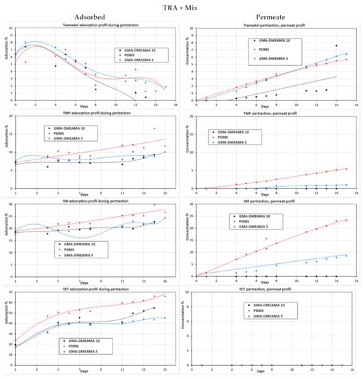 For investigating all bare and GMA-DMAEMA grafted PDMS membranes’ behavior, the pertraction of the model solution loaded all with the tramadol and antibiotics mixtures (SM, TMP, and TET) was performed (see Figure 9). Concerning tramadol, high membrane adsorption was spotted during the first days of pertraction, mainly due to the higher concentration of tramadol and the diffusion process at its early stages. The permeate profile shows that GMA-DMAEMA 5 and bare PDMS membranes are much better for tramadol diffusion compared to GMA-DMAEMA 10, as proven previously by diffusion coefficients. Moreover, the GMA-DMAEMA 5 and bare PDMS membrane proved a positive linear regression, where the GMA-DMAEMA 5 curve had the highest regression coefficient. Regarding TMP, the bare PDMS membrane showed the best performance of adsorption and permeation compared to modified GMA-DMAEMA 5 and GMA-DMAEMA 10, which showed a nearly null permeation for TMP. The weak TMP permeation of the GMA-DMAEMA 5 membrane is mainly due to TMP permeation resistance of grafted monomers on the membrane. Similar behaviors were observed on the SM pollutant, where the bare PDMS membrane permeates SM much better than TMP. Comparable behaviors were noticed on GMA-DMAEMA 5 toward SM pollutants. However, GMA-DMAEMA10 remains impermeable for both TMP and SM, except for TRA, which could diffuse through it. Finally, the most adsorbed pollutant for all three membranes, bare PDMS, GMA-DMAEMA 5, and GMA-DMAEMA 10, is TET, which could not diffuse throughout any of the three tested membranes.