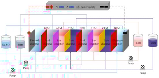 The salt chamber solution was lithium bromide of varying concentrations, and the electrode chamber was filled with a 0.3 mol/L sodium sulfate solution. To ensure the smooth functioning of the BMED system, a certain amount of hydrobromic acid and lithium hydroxide was added to the acid chamber and alkali chamber, respectively, at the beginning of the experiments. All chemical reagents used were of analytical grade and were purchased from China National Pharmaceutical Group Co., Ltd., Shanghai, China. The anion-exchange membrane (AMX), cation-exchange membrane (CMX), and bipolar membrane (BP-1) used in the experiments were all purchased from ASTOM Corp., Tokyo, Japan. The main characteristics of the membranes used are shown in Table 1.