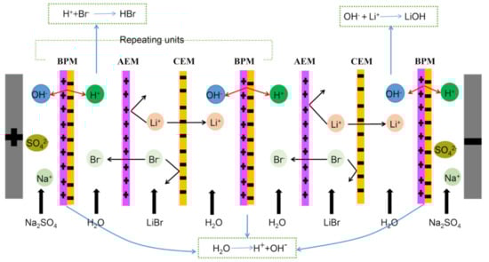 Because of these advantages, we tried to establish a bipolar membrane electrodialysis system to recover lithium bromide waste. In this system, the lithium ions pass through the cation-exchange membrane and the bromide ions pass through the anion-exchange membrane to combine with the hydroxide ions and protons produced in the bipolar membrane, respectively, forming lithium hydroxide and hydrobromic acid and thus achieving the conversion of lithium bromide to lithium hydroxide. In this paper, we aim to explore the feasibility of the treatment of lithium bromide using BMED and to estimate the factors that affect the performance of the BMED system to achieve an optimized treatment effect. Though the main focus of the study is on the effective treatment of lithium bromide waste, a novel production process for lithium hydroxide could also be developed. An added advantage is that the expensive reagent, hydrobromic acid, is obtained as a by-product during the process. Finally, an economic estimation is performed to give more insight into the advantages of the bipolar membrane electrodialysis technology in enhancing the process outcome.