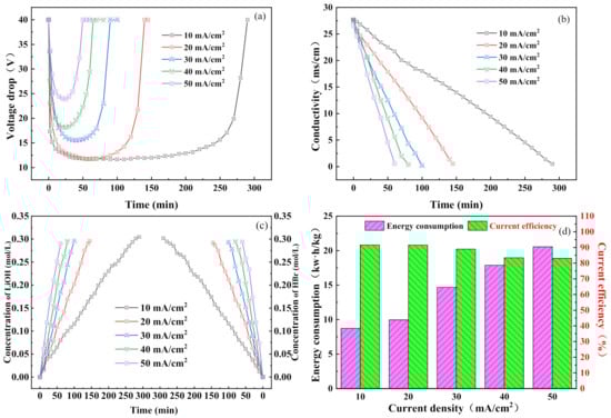 Effect of current density on BMED performance: (a) BMED stack voltage drop; (b) the conductivity of the salt chamber; (c) hydrobromic acid concentration in the acid chamber and lithium hydroxide concentration in the alkali chamber; (d) energy consumption and current efficiency of the whole process.