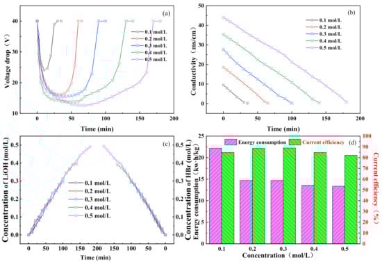 Effect of feed concentration on BMED performance: (a) BMED stack voltage drop; (b) the conductivity of the salt chamber; (c) hydrobromic acid concentration in the acid chamber and lithium hydroxide concentration in the alkali chamber; (d) energy consumption and current efficiency of the whole process.