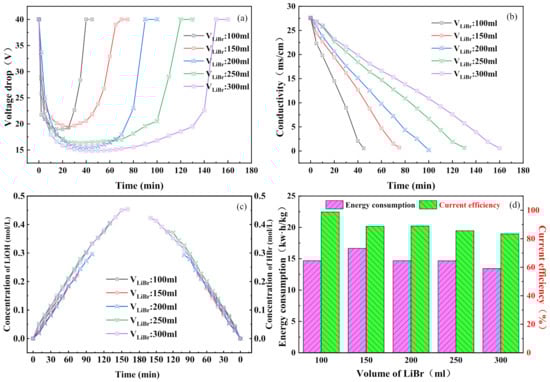 Effect of initial salt chamber volume on BMED performance: (a) BMED stack voltage drop; (b) the conductivity of the salt chamber; (c) hydrobromic acid concentration in the acid chamber and lithium hydroxide concentration in the alkali chamber; (d) energy consumption and current efficiency of the whole process.