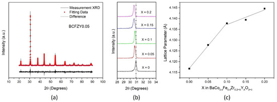 Structural data for (a) BCFZY0.05 with Rietveld refinement, (b) all compositions for (110) plane, and (c) lattice parameter calculated from XRD.