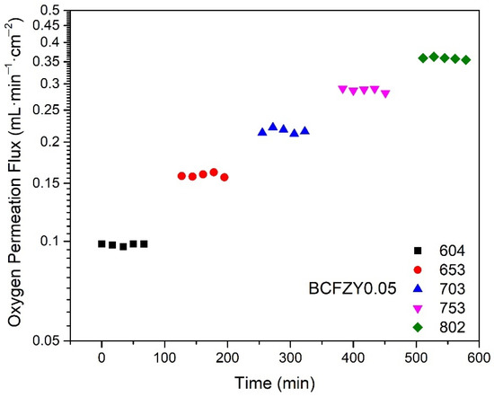 A representative figure of the oxygen permeation flux as a function of measurement time is shown in Figure 2 for BCFZY0.05 at temperatures of 600 to 800 °C. After ramping, the temperature is held for 30 min to ensure stabilization of any temperature hysteresis before performing the measurement. Each measurement lasted approximately one hour, with individual gas samples taken in 15-min intervals. The flux remains stable throughout the duration of each temperature. No secondary phase formation or microstructural changes were observed after the permeation measurements as confirmed by SEM/EDX analysis, indicating good material stability in these conditions. In all samples, the final three measurement points at each temperature were averaged as the representative permeation flux for further figures and discussion.