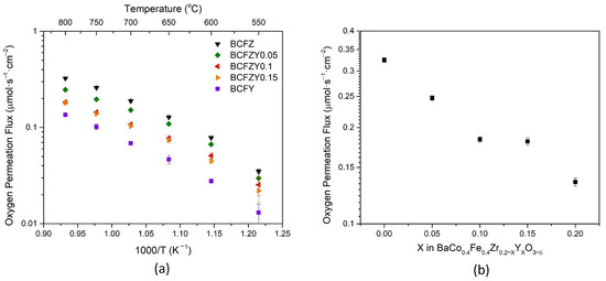 Figure 3a displays the oxygen permeation flux as a function of membrane temperature for all BCFZYX compositions, normalized to 1 mm thickness. Error bars were calculated from measurement propagation error and the standard deviation of the three representative data points. It is observed that as Y substitution increases, the oxygen permeation flux decreases. At 800 °C, as shown in Figure 3b, BCFZ exhibits a flux of 0.485 mL∙min−1∙cm−2, markedly similar to previously reported literature [34], and continues to decrease with Y substitution until it reaches a plateau for the BCFZY0.1 and BCFZY0.15 compositions, followed by a continued decrease in flux to 0.198 mL∙min−1∙cm−2 for BCFY. The general trend of decreasing flux with increasing Y is somewhat unexpected, as it was hypothesized that increasing oxygen vacancies in the material would result in more pathways for oxygen diffusion. Based on the structural data from XRD, the estimated free volume and average metal-oxygen bond energy would also suggest that increasing Y concentration would cause an increase in oxygen mobility. Rather, it is hypothesized that Y substitution distorts the lattice from BCFZ due to its much greater ionic size than Zr, Fe, and Co, thus decreasing perovskite symmetry. The decreasing crystal symmetry may cause larger vacancy-lattice interactions and may help explain the trend for oxygen mobility in this materials system [35].