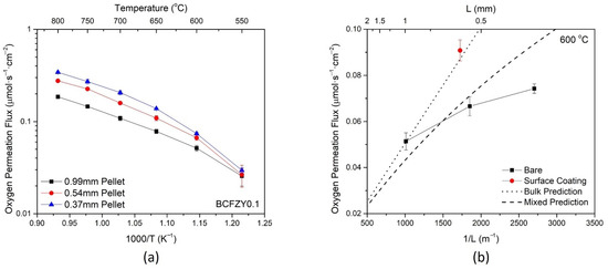 Oxygen permeation flux for the BCFZY0.1 sample (a) as a function of temperature, under varying thicknesses, and (b) as a function of thickness at 600 °C.
