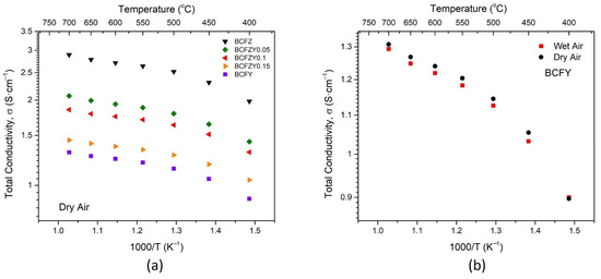 In wet (2.3% H2O) atmosphere, the total conductivity uniformly decreases by about 0.02 S∙cm−1 across all samples and temperatures, as seen in Figure 5b for the BCFY composition. This difference in conductivity is attributable to Equation (3), where in redox-active materials, an introduction of humidity leads to a reduction in the hole concentration and conductivity of all compositions at constant oxygen partial pressures [40]: