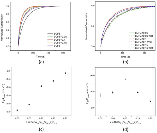 The resultant normalized conductivity curves were fitted using the diffusion equations to determine kchem and Dchem, specifically using the ECR tool developed by the National Energy Technology Laboratory (NETL) [42]. In Figure 6c,d, the calculated surface exchange coefficient (kchem) and diffusion coefficient (Dchem), respectively, are displayed as functions of composition. From these data, it is evident that kchem increases with increasing Y substitution, which agrees with the expectation that an increase in Y substitution increases the oxygen vacancy concentration, resulting in more active sites for surface exchange and reduction via Equation (3). The surface exchange coefficient k decreases with the introduction of water to the atmosphere (Figure S6), exhibited by the increase in relaxation time. The diffusion coefficient, Dchem, does not appear to have any clear trend; kchem has an overall order-of-magnitude increase over the range of Y substitution, while Dchem only changes by about a factor of 2 from its lowest (BCFY) to its highest (BCFZY0.1) values. BCFZY0.1 has the fastest response time of all samples, which may be attributed to the best combination of bulk diffusion with surface exchange.