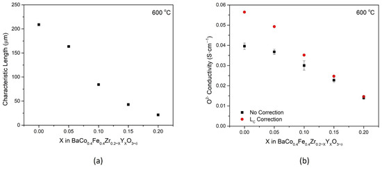 (a) The characteristic thickness, LC, at 600 °C, calculated from ECR measurements for each BCFZYX composition. (b) Oxygen ion conductivity estimated using the Wagner equation with and without a correction for the characteristic thickness.