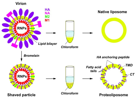 “Native” liposomes composed of viral lipids and proteoliposomes composed of viral lipids and containing the C-terminal HA anchoring peptides (LI45) were prepared in a similar way using the protocols of [22] with some modifications. The protocols for preparation of native liposomes and proteoliposomes are schematically depicted in Figure 1.