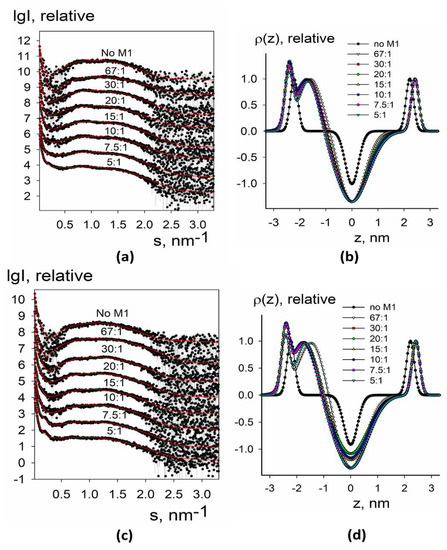 Experimental small-angle X-ray scattering patterns obtained for synthetic liposomes without and with added M1 protein are presented in Figure 3a,c and Figure 4a,c. The data from protein-free liposomes contained a wide maximum in the middle part of the angular range that is typical for the bilayer lipid vesicles [39]. At the same time, at low angles, there was a fast upturn of the scattering intensity that suggested the presence of large particles (with diameters of up to 1000–1500 nm) and vesicle size polydispersity. Such characteristic features of the curves (upturn at low angles and wide peak in the middle part) were present for all samples and could be taken into account within separated form factor (SFF) approximation [40], where the scattering signal is represented as a product of the form factor from large spherical shells (providing information about vesicle size) and the form factor from the flat lipid bilayer (describing the electron density profile across the bilayer). The algorithm implemented in the program BILMIX [35] takes into account the size polydispersity of the vesicles and permits one to model both symmetric and asymmetric electron density profiles. We employed the above algorithm for modeling the experimental small-angle X-ray scattering data (see Materials and Methods for details).