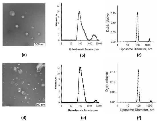 Generally speaking, liposomes obtained via extrusion through 100 nm pore diameter in polycarbonate membranes had different sizes [36,37,38]. As seen from EM images (Figure 2a,d), they were roughly from 50 to 300 nm in diameter. However, the main peak from DLS measurements corresponded to 100 nm diameter, which was the dominant size of the liposomes.