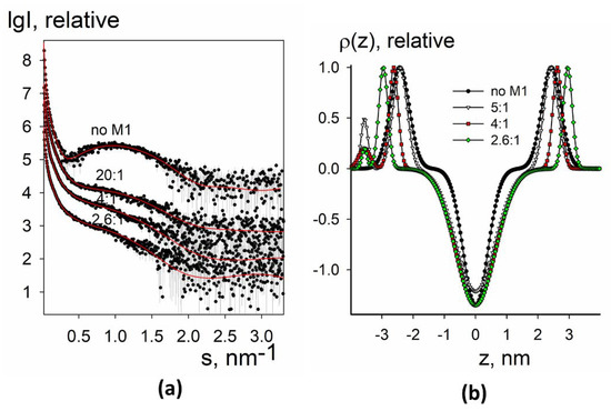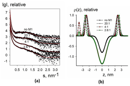 SAXS and BILMIX analysis of native liposomes composed of lipids extracted from A/Puerto Rico/8/34 (H1N1) virus envelope loaded with M1 protein. (a) Experimental are shown by dots with error bars, the fits obtained by BILMIX are shown as red curves. The curves are shifted by one logarithmic order for better clarity; (b) the restored electron density profiles of the lipid bilayer before (black curve) and after (color curves) loading with M1. The molar lipid:M1 ratios are the following: no M1, 20:1, 4:1, 2.6:1.