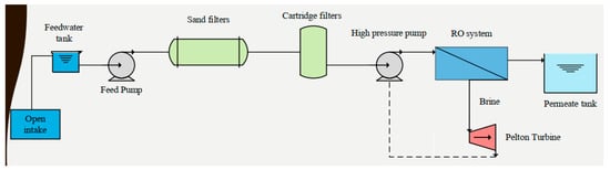 Figure 1 describes how the process is managed to get the appropriate high quality permeate water. There is an open intake with a feed water tank and pumping before physical pretreatment with sand filters in a first stage and cartridge filters in a second stage. No chemical pretreatment (not even an anti-scalant) is used due to the high quality of the feed water. After pretreatment, there is a high-pressure pump before the reverse osmosis system in one stage. The brine goes directly to the Pelton turbine and the product ends up in the potable water tank.