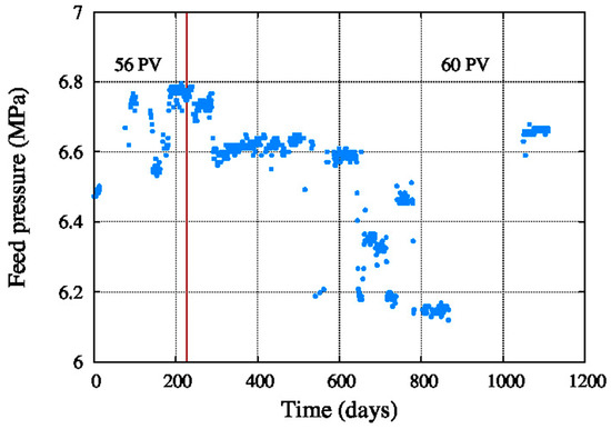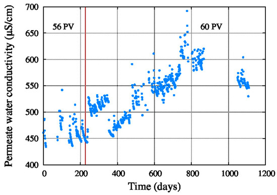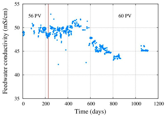 According to the results, feed water conductivity decreases, and feed pressure decreases mainly after 600 days operation, both together. One can find bthe ion concentrations of the feed water in Table 2.
