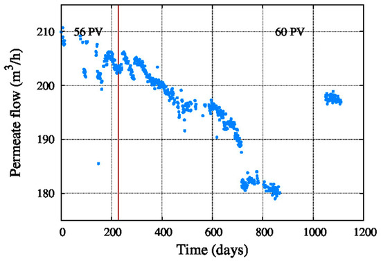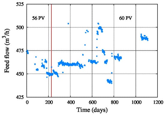 Figure 5 shows the water feed flow, which was between 410 and 510 m3/h during the operating period. Therefore, the feed flow is stable in between this interval.