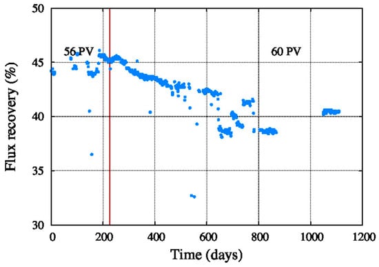 Figure 6 shows the decrease of the system recovery from 46% to 38% operating with 56 pressure vessels of seven elements each one. Therefore, after approximately 900 days of operation the number of pressure vessels was increased to 60 to boost the system recovery to at least 40%. This figure shows an increased performance decay which could be due to fouling, scaling and compaction occurred during the years of operation.