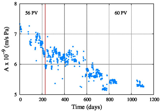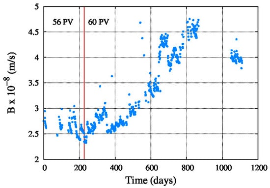 Figure 9 shows the average water permeability coefficient, which decreased since the startup of the system until the end of the period. The same happens in Figure 10 with the average salt permeability coefficient, but in this case the value is increasing with the aging of the reverse osmosis membranes.