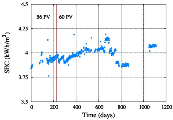 The energy consumption also depends on the feed pressure, which is in between 6.1 MPa and 6.8 MPa, so the difference is not too much, only 0.7 MPa, and the energy consumption is stable during the studied period of the system.