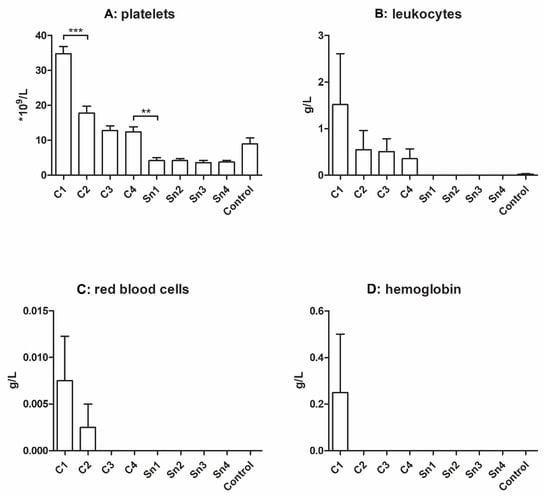 Besides, more leukocytes were found in the more concentrated groups, but the differences were not significant. The control group also contained some leukocytes, but in the supernatants their number was under detectable limits. In the case of red blood cells, we could measure them only in the C1 and C2 groups. The hemoglobin level was examined to obtain information about disrupted red blood cells, but its level was measurable only in the C1 group (Figure 1B–D).