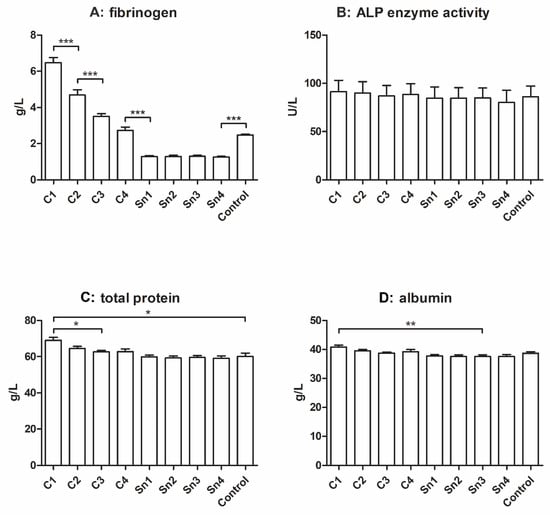 Fibrinogen ((A), n = 6), total protein ((C), n = 6), and albumin ((D), n = 6) concentrations, and ALP enzyme activity measurement ((B), n = 4). The cryoprecipitate was dissolved in 10 mL (C1), 20 mL (C2), 30 mL (C3), and 40 mL (C4) plasma, Sn1, Sn2, Sn3, and Sn4 are the supernatants collected from above the cryoprecipitate, respectively, and plasma was used as a control. The significance level was p < 0.05, where * means that p is between 0.01 and 0.05, ** means that p is between 0.01 and 0.001, and *** means that p is lower than 0.001, and data are presented as mean ± standard error of the mean.